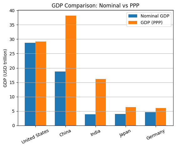 While, Nominal GDP shows economic size at market exchange rates (global financial power), the PPP GDP adjusts for cost of living and domestic purchasing power (real economic weight). A comparative study of the GDP in PPP terms throws a completely different picture. The Nominal GDP ~ $4+ trillion; PPP GDP ~ $15+ trillion.