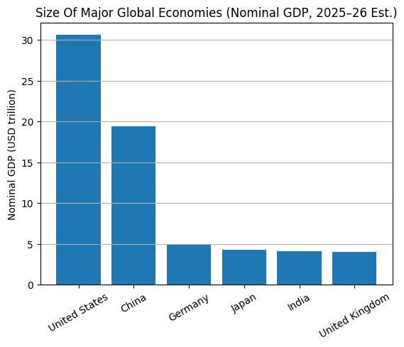 United States and China dominate global GDP, together accounting for nearly half of world economic output. India’s economy (~$4.5 trillion) has moved ahead of Japan and the UK in nominal GDP rankings to become the 4th largest economy in the world. Projections suggest India could overtake Germany to become the 3rd largest in the coming years.