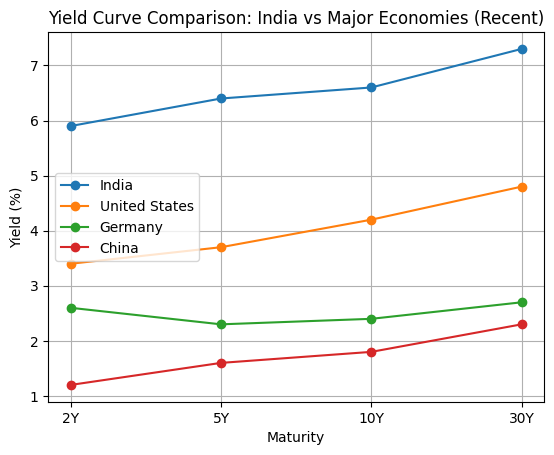 India. The curve is highest across all maturities and clearly upward sloping. It indicates that the markets demand a higher return to lend long-term to India. This reflects stronger growth expectations and premiums for developing market and for inflation, thus pointing towards an emerging economy with structural growth.
